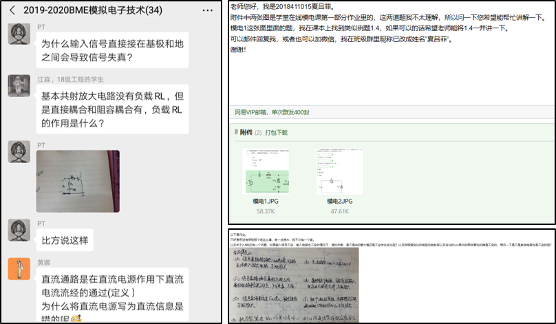 本门课程在线学习开展以来,进展顺利,学生都能积极、主动参与到这次新鲜的自主学习中来。学生能够按照课程要求,及时完成学习任务并提交。另外,学生也能踊跃参与答疑活动,通过邮件、微信群等方式提出自己在自主学习中遇到的问题以及与对本门课程教学的建议(图4)。