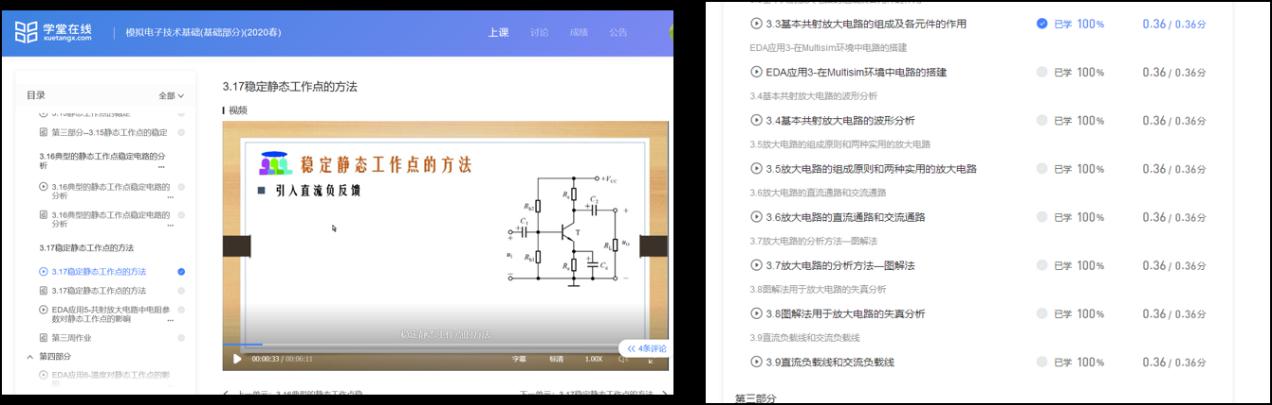 在线教学开展前,对本门课程的自主学习与考核方案做了精心设计。本课程选择学堂在线慕课平台上清华大学模拟电子技术基础作为线上免费学习资源,该视频与本课程使用的教材完全匹配,整套视频均由1个知识点精讲微视频+几道配套作业组成(图1)。学生在完成每个知识点的学习后,可以线上练习配套作业及时检验学习效果,如对新知识有不理解的地方,学生可以反复进行学习,提高学习效果。充分利用学校课程中心资源,将本门课程的课件资料、自主学习方案(教学进度计划、课后作业、答疑安排等)与考核方案,提前发布在课程中心网站(图2)。自主学习开展前,在课程微信交流群中提醒学生登录学校课程中心获取本门课程的在线教学信息,了解具体的自主学习与考核方案,针对学生有疑问的地方及时解释,保证自主学习顺利开展。