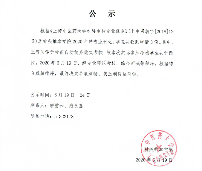 针推2020转专业结果公示