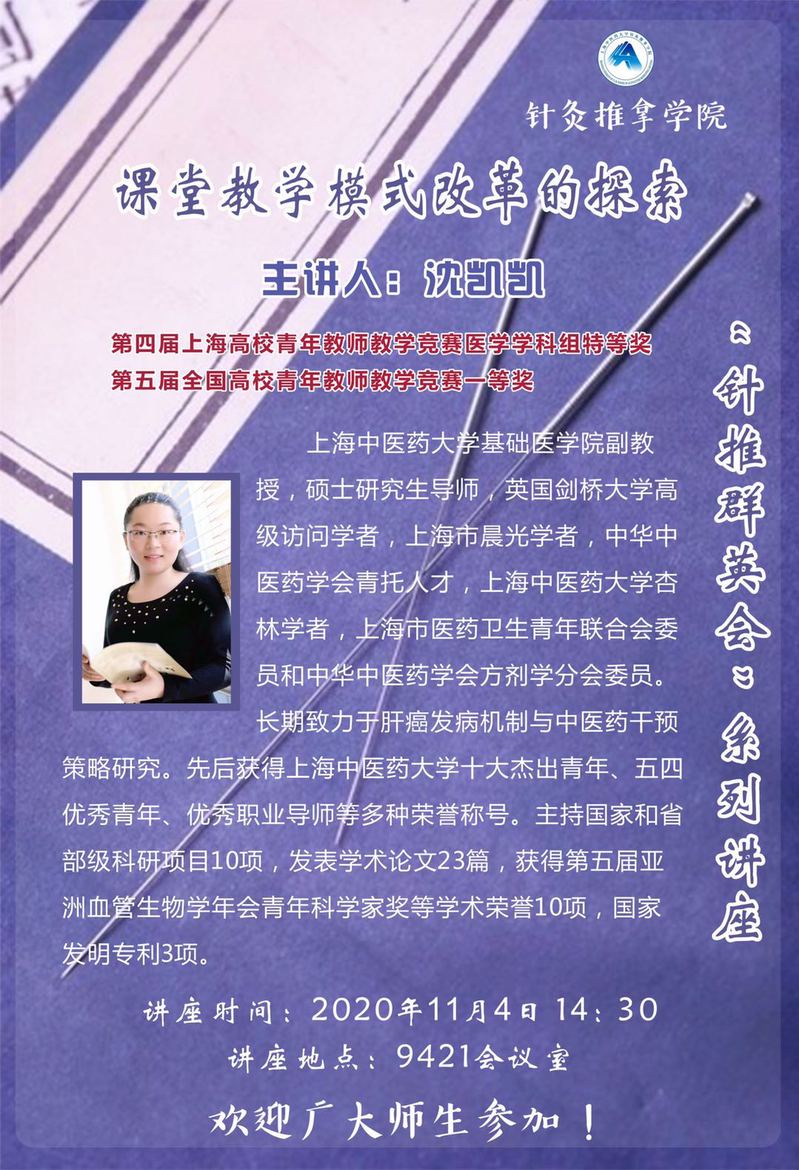 为了进一步推进课堂教学改革,提升教学质量,打造高效课堂,11月4日下午,漫画柜 邀请第五届全国高校青年教师教学竞赛决赛医学组一等奖、第四届上海高校青年教师教学竞赛决赛医学组特等奖获得者沈凯凯副教授,以“创新开展课堂教学的‘教与学’模式改革的探索”为主题,与学院全体教师进行面对面的分享与交流。