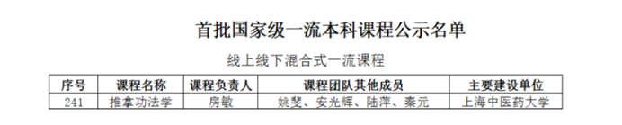 《推拿功法学》入围“线上线下混合式一流课程”,此项荣誉的获得,是上海推拿教学团队在国家级高等教育教学成果奖一等奖和上海市高等教育教学成果奖特等奖等奖项后的又一新突破。