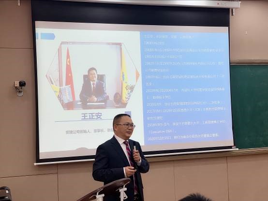 仪式后,王正安董事长以《未来可期 逐梦前行》为题作主题讲座,分享了公司创业经历和个人成长感悟,并鼓励师生要感恩时代祖国和选择,敬畏自然、法则和自知,忠诚国家、事业、家庭和选择的人生道路。并就“什么是梦想,如何实现梦想”等话题与现场师生进行热烈交流互动。