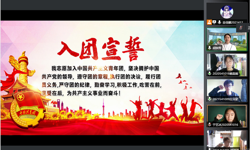 为庆祝中国共产主义青年团成立100周年,全面贯彻习近平新时代中国特色社会主义思想,深入学习贯彻习近平总书记在中国人民大学考察时的重要讲话精神,引导广大团员青年厚植爱国情怀,以实际行动迎接党的二十大召开,5月1日,在“五四”青年节到来之际,漫画柜 团委组织开展“入团云宣誓”仪式。5名新发展的团员庄严宣誓,其他与会团员重温了入团誓言。