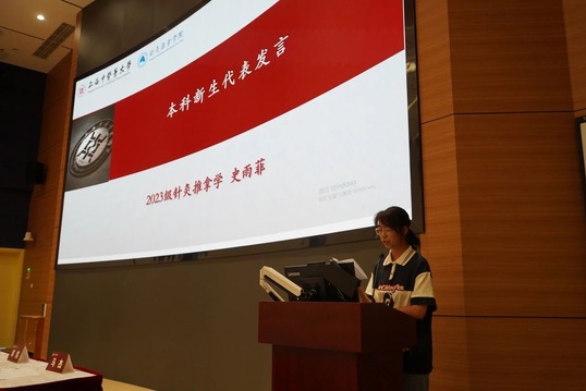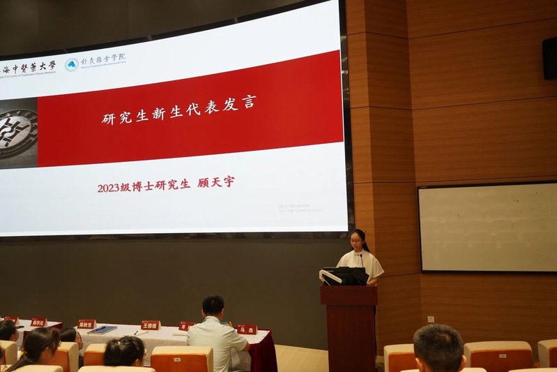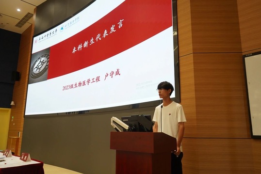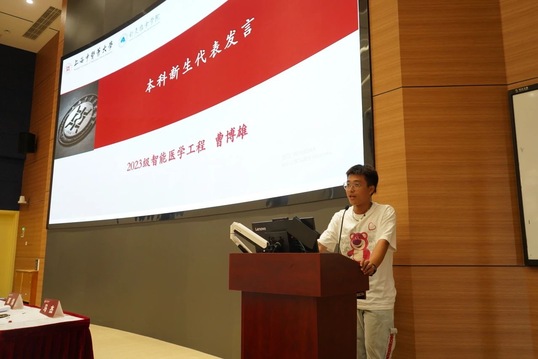 2023级生物医学工程户守成、智能医学工程曹博雄,作为学院工科专业本科新生代表发言。他们生动朴素地分享了自己入学两周以来的美好感受,并期待未来四年的学习生涯,能够学有所成,为传统中医药学赋能最新科技成果,从而为临床工作者提供助力,共同服务人民健康。