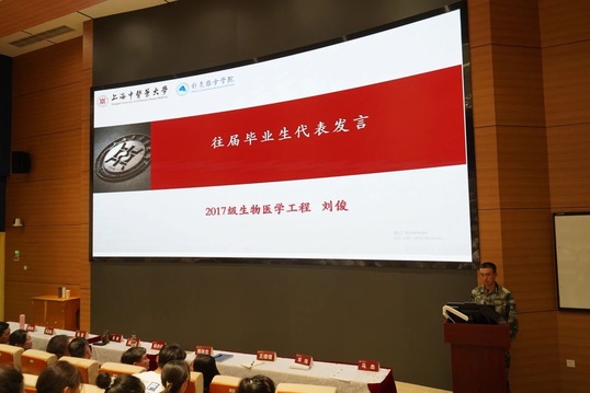 2017级生物医学工程专业学生刘俊作为往届生代表发言。2021年本科毕业前夕,他怀着满腔热情,响应号召光荣入伍。两年的军旅生涯,锤炼了他的意志、增长了他的才干,使他的精神面貌焕然一新。