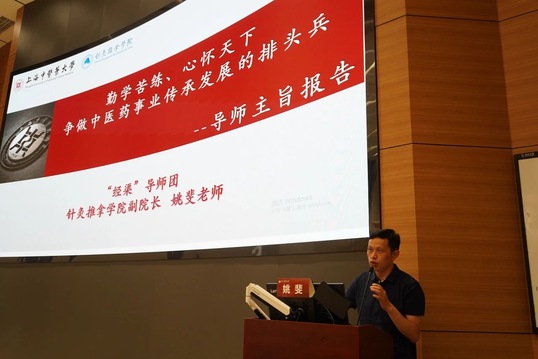 “经渠”导师团执行团长姚斐作了“勤学苦练、心怀天下,争做中医药事业传承发展的排头兵”的主题发言。他为新生们送上了3条锦囊妙计“融合发展、聚焦目标、坚持不懈”,并用自己的人生格言“努力到无能为力,拼搏到感动自己”与全体新生共勉。