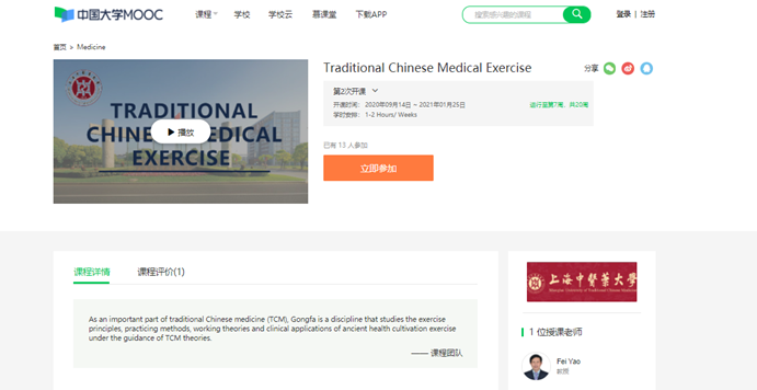 在线课程建设成果:重视信息时代学生自主学习能力培养。率先建设了《推拿功法学》在线课程,在人卫慕课平台运行5期,已有超过5000余人选课;英文版“中国传统功法”在线课程《Traditional Chinese Medical Exercise》,是教育部首批国际在线课程,成为中医国际化的先行者和排头兵。