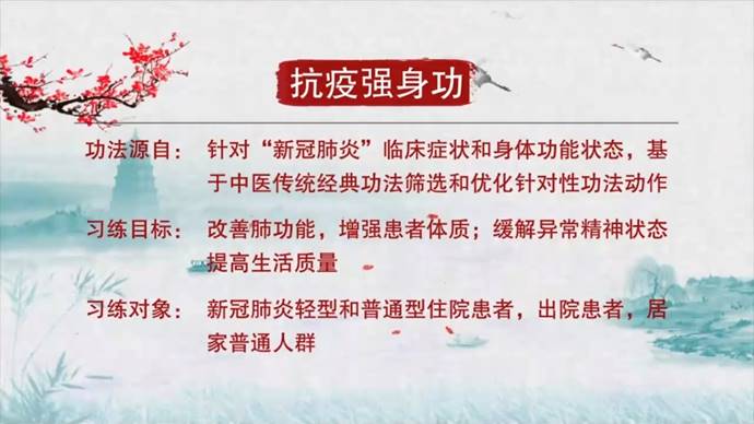 2020年新冠爆发初期,房敏教授团队第一时间制作了“抗疫强身功”。将功法锻炼资料及时发放到武汉雷神山医院、湖北黄石市中医医院、湖北六七二中西医骨科医院等多家医疗机构,指导患者锻炼;并在国内外抗疫实践中推广使用,受益人数超过50万。“抗疫强身功”应用方案被WHO 收录,并于 COVID-19 / Global literature on coronavirus disease 进行了网络首发。